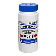 • Apo-Doxy capsules 100 mg are blue hard gelatin capsules containing doxycycline hyclate equivalent to 100 mg of doxycycline, supplied in bottle of 100.