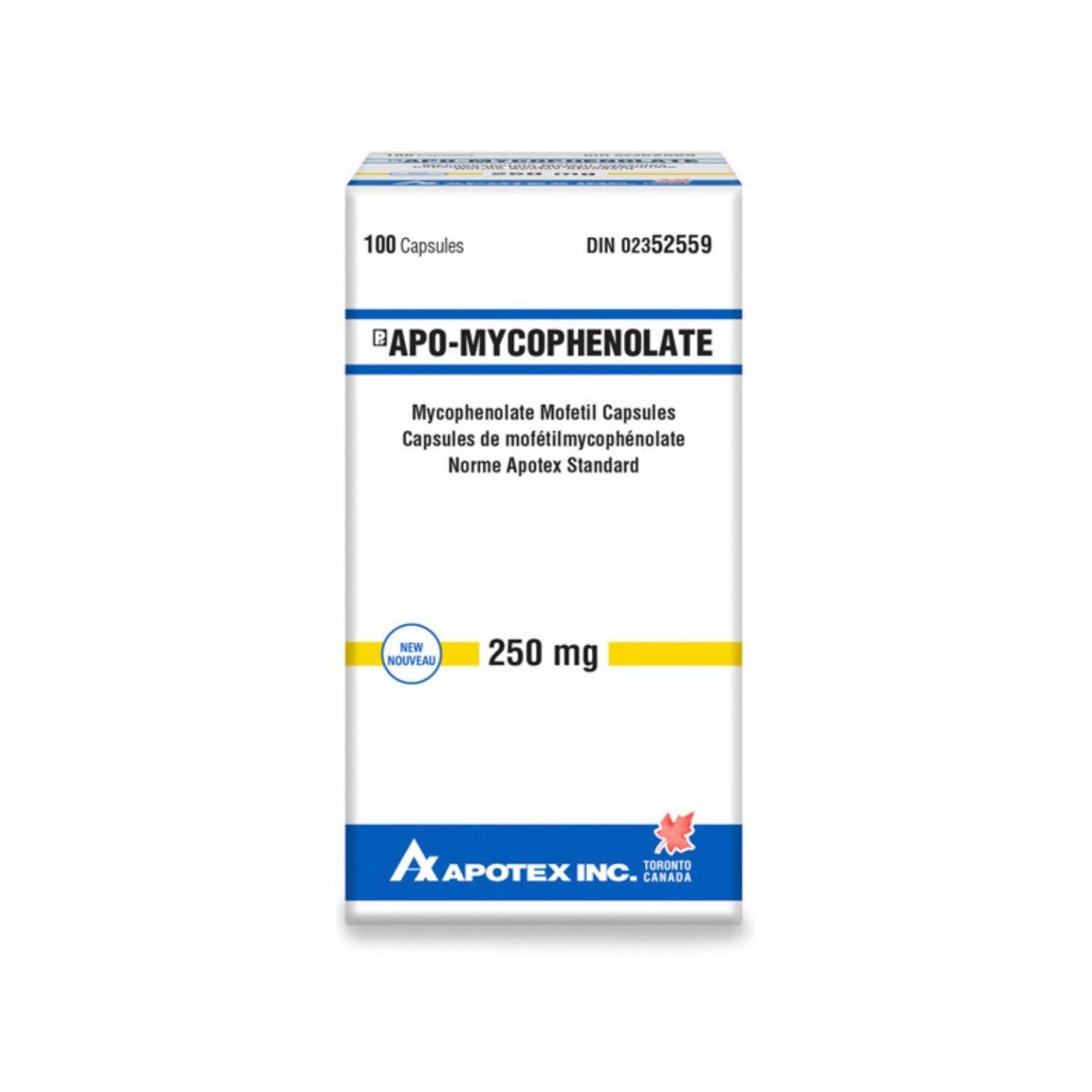 APO-MYCOPHENOLATE capsules are available for oral administration as capsules containing 250 mg of mycophenolate mofetil. APO-MYCOPHENOLATE are light blue/peach size ‘1’ hard gelatin capsule imprinted with ‘MMF’ on cap and ‘250’ on body, containing white to off white powder.