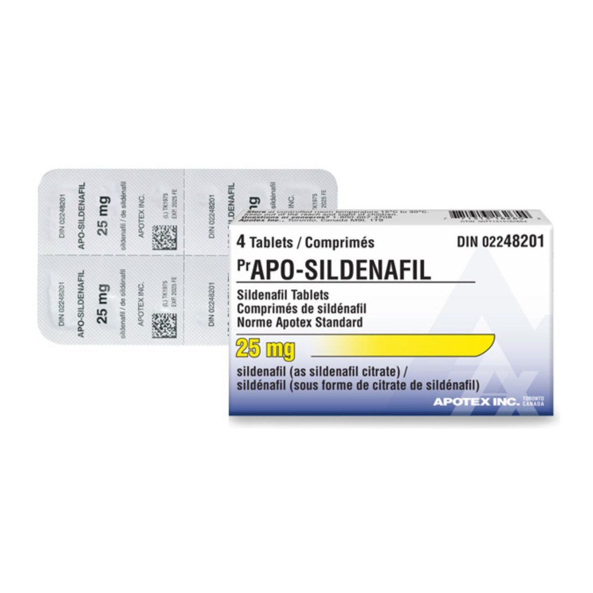 APO-SILDENAFIL 25 mg: Each blue, diamond-shaped, biconvex, film-coated tablet, engraved "APO" on one side and “SIL25” on the other, contains sildenafil citrate equivalent to 25 mg of sildenafil.  Supplied in bottles of 100 and blisters of 4. In addition to sildenafil citrate, the tablets also contain the following non-medicinal ingredients: colloidal silicon dioxide, croscarmellose sodium, hydroxypropyl cellulose, hydroxypropyl methylcellulose, indigotine aluminum lake 12-14% (Blue #2), magnesium stearate, microcrystalline cellulose, polyethylene glycol and titanium dioxide.