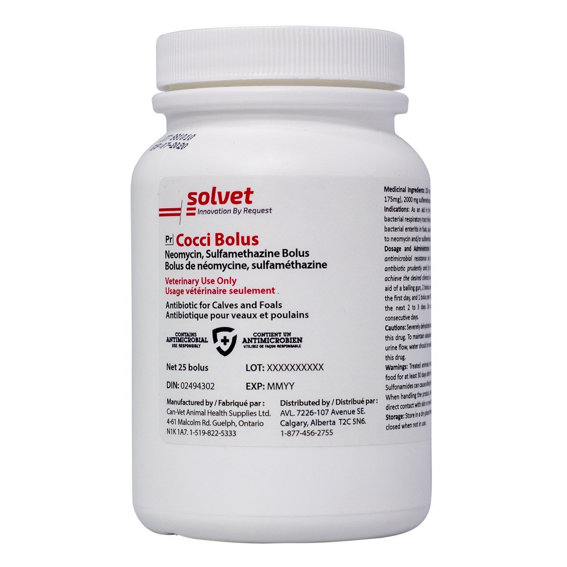 Cocci Bolus is a neomycin, sulfamethazine bolus use as an aid in the treatment of bacterial enteritis, bacterial respiratory tract infections and coccidiosis in calves, and bacterial enteritis in foals caused by microorganisms susceptible to neomycin and/or sulfamethazine.