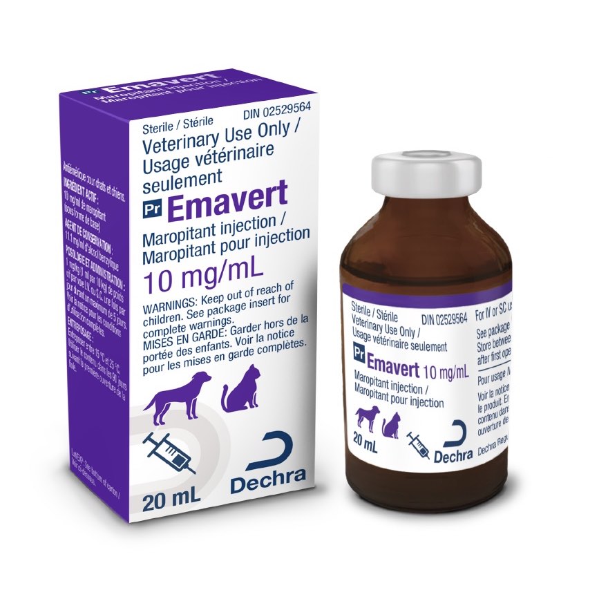 Emavert: A new and less painful maropitant formulation. Dechra’s new 10 mg/mL anti-emetic injection for dogs and cats. Contains benzyl alcohol preservative, shown to reduce pain at injection site.
