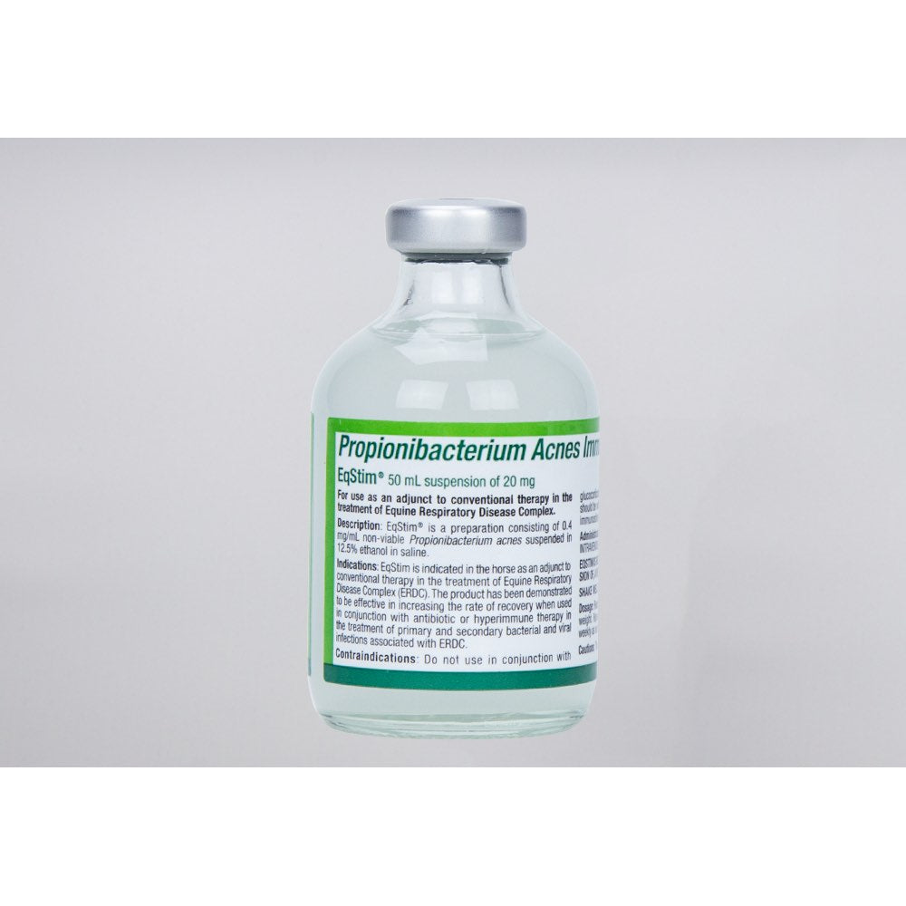 EqStim® is a preparation consisting of 0.4 mg/mL non-viable Propionibacterium acnes suspended in 12.5% ethanol in saline. EqStim is indicated in the horse as an adjunct to conventional therapy in the treatment of Equine Respiratory Disease Complex (ERDC). The product has been demonstrated to be effective in increasing the rate of recovery when used in conjunction with antibiotic or hyperimmune therapy in the treatment of primary and secondary bacterial and viral infections associated with ERDC.