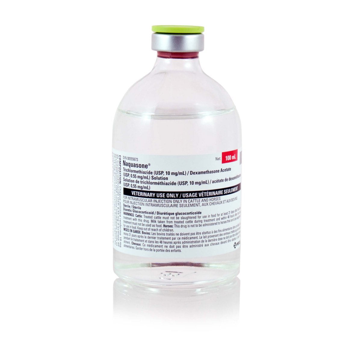 • NAQUASONE injectable solution contains trichlormethiazide USP, and dexamethasone acetate USP. It combines the effective diuretic activity of trichlormethiazide with the specific anti-inflammatory activity of dexamethasone for complementary action in the reduction of physiological inflammatory edematous conditions of the equine, and in the reduction of physiological parturient edema of the mammary gland and associated structures of cattle.
