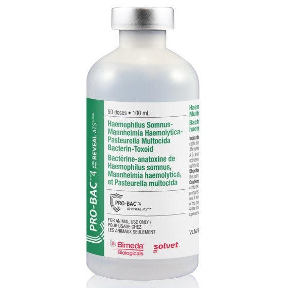 Pro-Bac 4 is effective for the vaccination of healthy cattle three months of age or older against Haemophilus somnus, Mannheimia haemolytica Type A-1, Mannheimia haemolytica Type A-6, and Pasteurella multocida Type A-3. Duration of immunity has not been determined.  For animal use only.