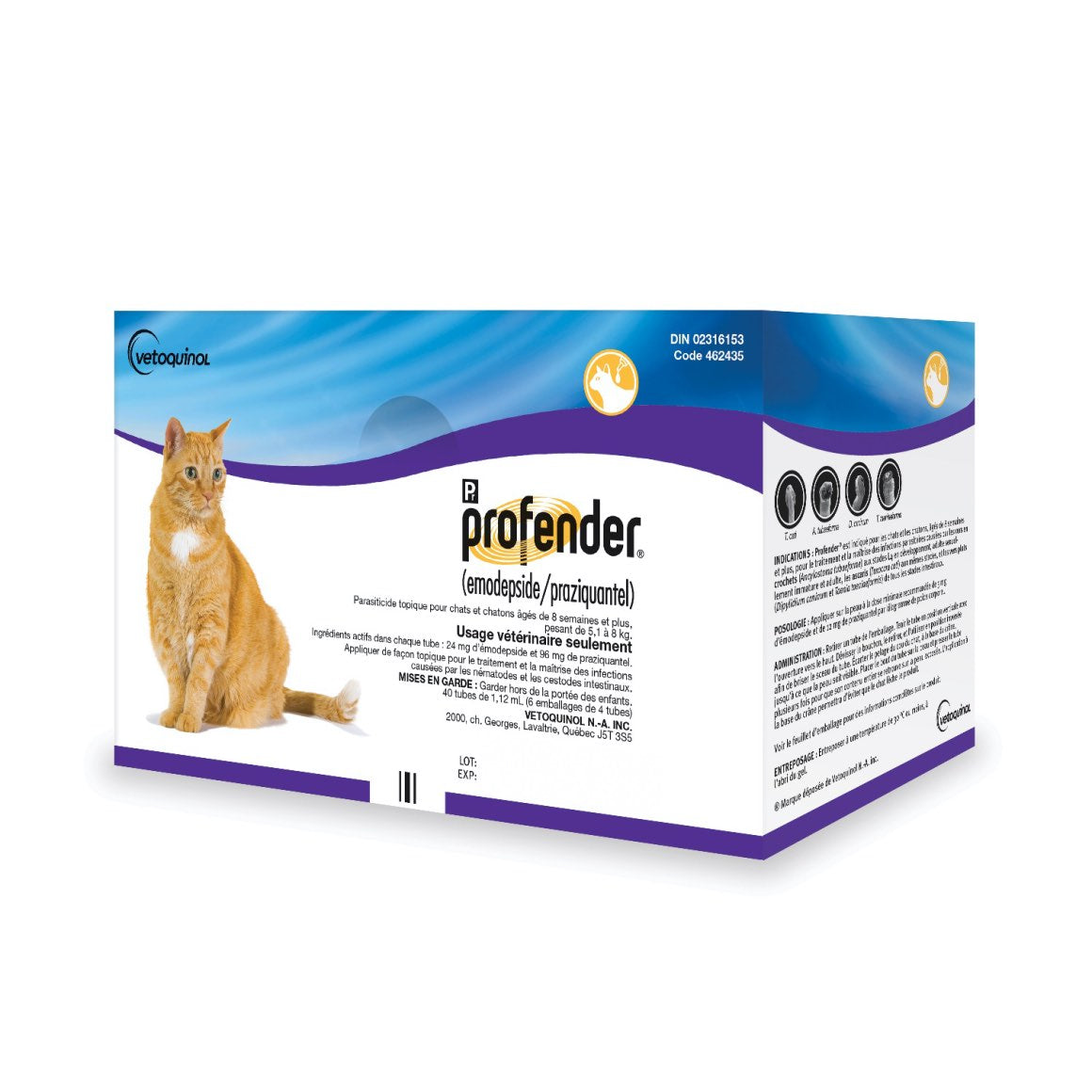 • Profender (emodepside + praziquantel) topical parasiticide is a clear yellow to brownish ready-to-use solution packaged in unit dosing applicator tubes for treatment of cats and kittens 8 weeks  of age and older. The formulation and dosage is designed to provide a minimum of 3 mg of emodepside and 12 mg of praziquantel per kg of body weight.