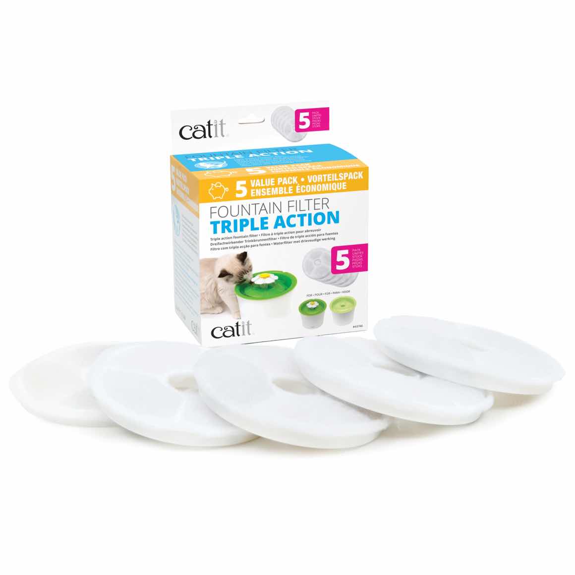 • The Catit Triple Action Fountain Filters are suitable for the Catit 2.0 Flower Fountain (Item 119861) and the Catit Design Cat Drinking Fountain - 3 L/100 fl oz (Item 111132).
