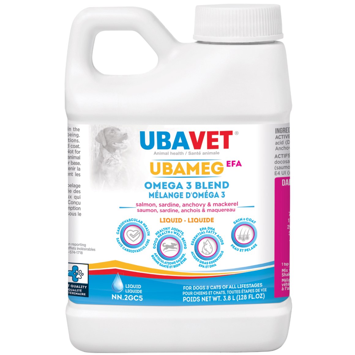UBAMEG EFA OMEGA-3 blend is used in the maintenance of good health and well-being. Supports renal and cardiovascular functions. Helps the maintenance of a healthy skin and coat.