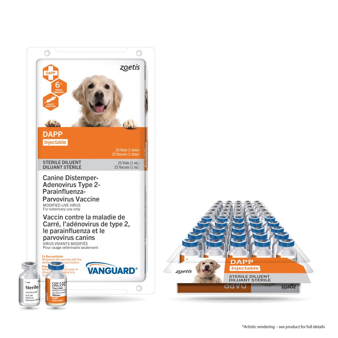 • Vaccin contre la maladie de Carré, l’adénovirus type 2, le parainfluenza et le parvovirus canins. Virus vivants modifiés.