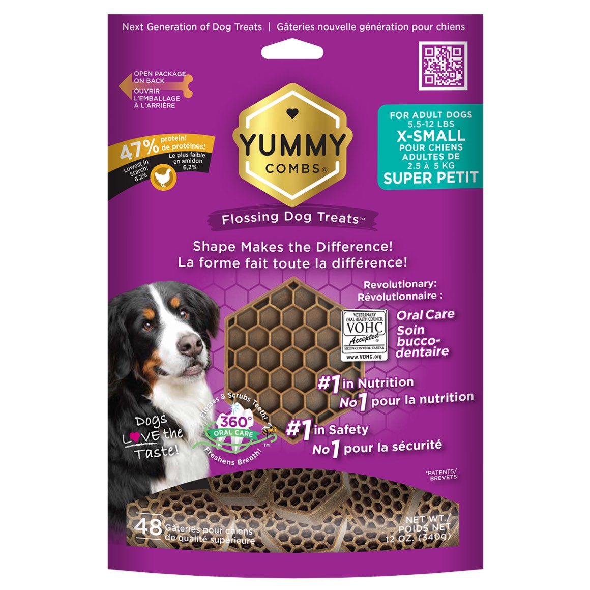 Yummy Combs revolutionary flossing dog dental treats are clinically proven to remove hardened tartar - VOHC Seal for tartar. Also clinically proven to reduce halitosis. Yummy Combs is complete and balanced, grain free, NONGMO, gluten free, with all natural ingredients. With 44% protein and less than 8% starch, Yummy Combs includes wellness ingredients such as honey, salmon oil, lecithin, vitamin E, niacin, vitamin A, vitamin D3, vitamin B12, minerals and yucca schidigera extract. Yummy Combs are formulated to meet the nutritional levels established by the AAFCO dog food nutrient profile.